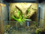 Nach einigen Stunden habe ich die Pflanzen mit viel gammeligem Moos in den Öffnungen befestigt. Ich hoffe auch, dass sich dort das vereinzelt nachwachsende Moos weiter verbreitet. Aus meinem Aquarium kam noch eine gute Hand voll Javamoos an die Rückwand und ins Wasser, da es nach meiner Erfahrung schnell schöne Teppiche bildet.